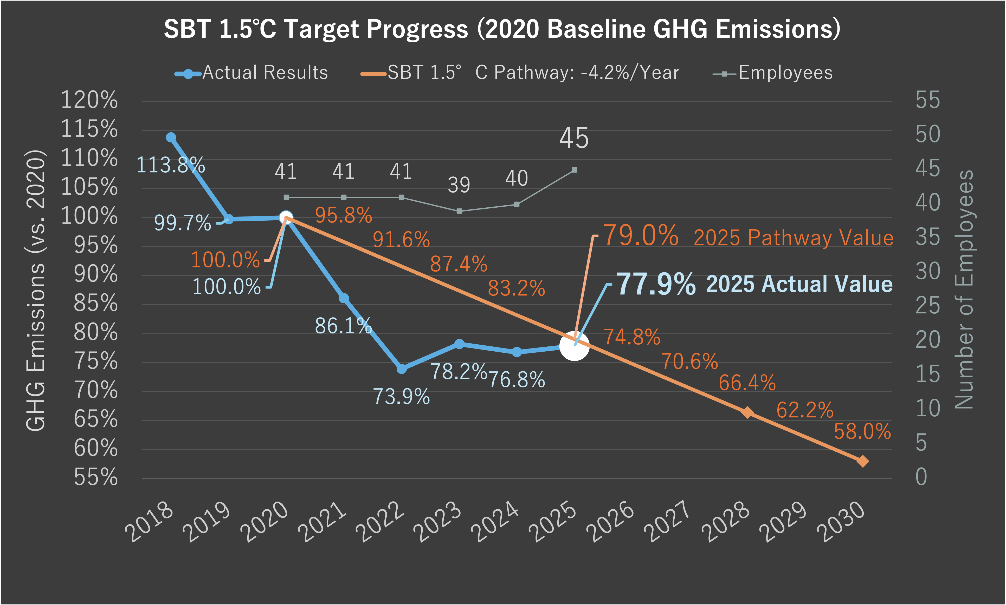 | ① | GHG emissions totaled 33.6 t‑CO₂e. Against the SBT 1.5°C pathway target of 79.0% relative to the base year, our actual result was 77.9% — target achieved. |